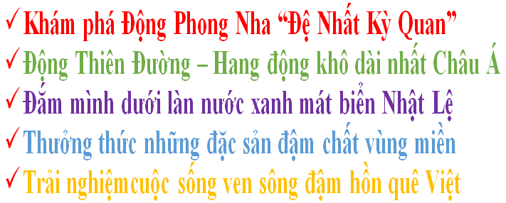 Sáng: Quý khách dậy sớm tắm biển và ngắm bình minh trên biển, đùa với những con sóng bạc đầu, phóng tầm mắt ra xa ngắm nhìn những con tàu đang hối hả cặp bến với những mẻ cá nặng chĩu. Ăn sáng tại khách sạn, đoàn tự do mua sắm tại chợ Đồng Hới hoặc nghỉ ngơi tự do, tắm biển Nhật Lệ …|