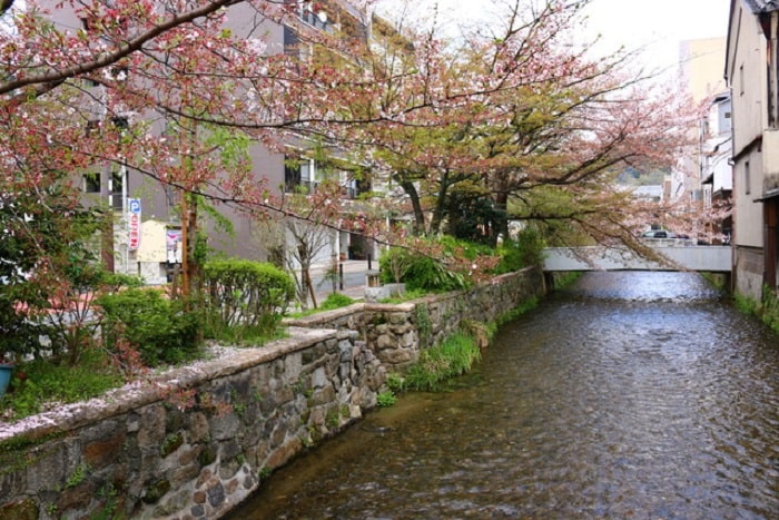 Đặc biệt nổi tiếng là cây hoa có tên Shidare-zakura nằm gần cầu Tatsumibashi. Hình dáng những cành liễu rũ xuống và đung đưa trên mặt sông Shirakawa cùng với dáng dấp khu phố Shirakawa với những dãy nhà xưa cũ vẫn giữ được nét hoài cổ y nguyên như thời Edo. Khi đi bộ trên con đường lát đá của khu phố, thỉnh thoảng du khách sẽ bắt gặp những nàng Maiko nhẹ nhàng, thướt tha trên phố. Xung quanh khu phố này còn có những ngôi nhà khách được cải tạo từ những ngôi nhà Kyo-machiya (loại nhà phố ở cố đô) nên du khách có thể trọ lại để thong thả đi dạo ngắm cảnh. Một vẻ đẹp trữ tình và yên bình đến lạ.